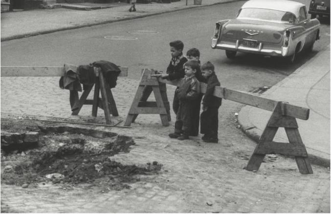 这几个孩子就像从海伦·莱维特(Helen Levitt) 的照片里走出来的, 尽管她和几年后的温诺格兰可能会做一些别的事情:一双脚从马路上的洞里伸了出来?这个像小弹坑的洞因施工而显得格外凌乱,但是根据路障上挂着的工作服,我们便可以判断出正在发生什么事情,也只有隐藏在画面之外的建筑工人才能说服孩子们有序地站在路障边观察,而不是跑到洞里面玩耍。对于孩子们而言,这个洞可能通向地球的中心,或者从另一边出去就到了中国。站在路障前面的那个男孩有着超越其年龄的老成,十年或十五年后,他可能以同样的姿势靠在墙上或者什么类似的地方打发自己的午休时间,或以同样的神态凝视着汽车打开的引擎盖。