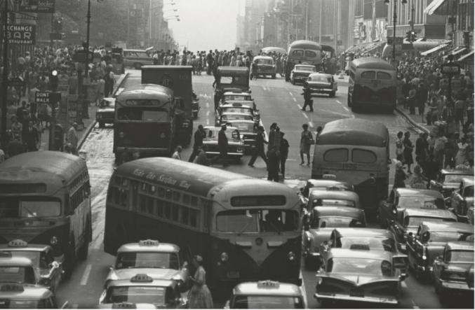 这是一件大尺幅的摄影作品,照片在这里成了一幅历史画。即便历史在这一刻驻足不前,作品也能将这一幕备份下来,呈现在人们目所能及的地方。正因如此,它很好地证明了马歇尔·伯曼(Marshall Berman) 在《一切坚固的东西都烟消云散了》中的观点:联邦高速公路管理局和住宅管理局“将城市视为交通阻塞的症结”而曼哈顿彻底地反驳了这一观点。照片中展示的是20世纪中叶的纽约熙来攘往、车水马龙的景象。交通和人口密度在一定程度上是长焦镜头聚束效应的产物。后来温诺格兰对长焦镜头的使用彻底失去了兴趣,便放弃了它,转而偏爱起广角镜头。于是,这张作品因摄影师对观看方式的抛弃而具备了某种考古学价值。这之后的温诺格兰将不再与拍摄主体保持距离,而是将自己也卷入框内,在这个空间里可以产生成百张照片。虽然如此拥挤,但他仍保有自己的空间。温诺格兰将在拍摄的过程中重新发现伯曼声称已丢失的诀窍:“在路上的同时,成为路障。”