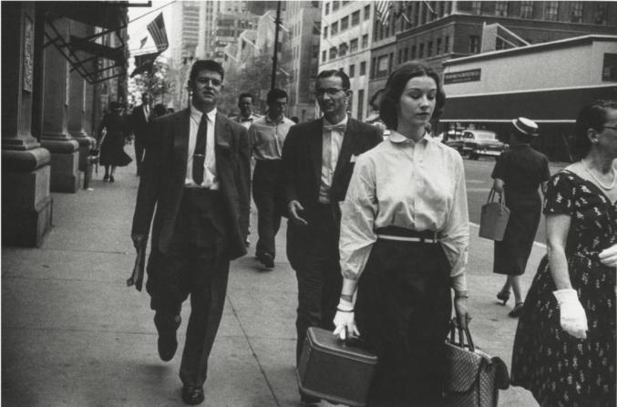 这是一个典型的温诺格兰早期街头摄影的场景。他站在人行道上,让世界如河流般从他身边淌过。温诺格兰之后有一本摄影集的名字叫作《女人是美丽的》。那么这件作品中的女人呢?从某种意义上说,并不。她很漂亮,这毫无疑问,但缺少一些能真正吸引温诺格兰的特质。在一定程度上,这是一个时代问题。这张照片拍摄于20世纪50年代,她身后的两个男子中有一个佩戴着领结便是这一年代的特征(稍远处还有另一个人也戴着领结)。50年代是西装和领带的世界,男人的世界,前女权主义者的世界,因此中间这位女性即使与她身边年长的妇人交换服装,也丝毫不会削减其个人意志和自由。那个年代的女性穿着相似,她们戴着白色的手套,已经习惯了以相同的方式行事:要漂亮,要恭敬,要做饭,要结婚生子。中间的女人身上有着过盛的女性气质。她眉眼低垂,像是一名艺伎,或一个被设计得无可挑剔的机器人。