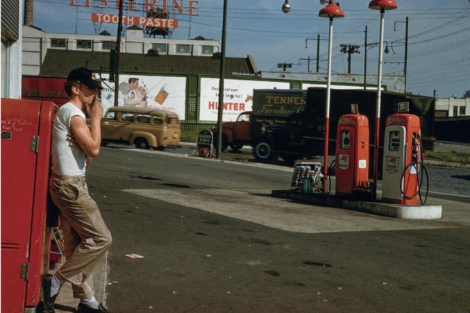 最后两句话是温诺格兰被引用最多的格言之一,但不可思议的是,他在看到弗兰克的作品之前,已经拍摄了这张加油站的照片。温诺格兰的作品显然存在着比弗兰克更多的东西:有一个靠在冷冻可乐机上抽烟的人。照片的前景空地形成了一部分的留白,但照片的主角还是其中的颜色。红色的可乐机和白色的T恤、美孚的加油泵和灯、白色广告牌上红色的“HUNTER”字样, 还有蓝色天幕下“LISTERINE”红白相间的牙膏标志, 以及加油站前丢在空地上的红色香烟盒。