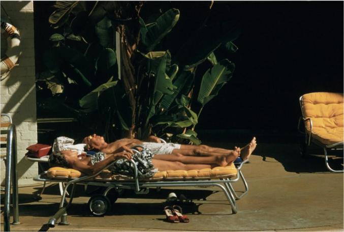 显然,人们在享受日光浴,但从今天的角度来看,这样的日光浴形式似乎有些不计后果。这张照片里有明黄的躺椅和古铜色的身体,却没有防晒霜的踪影——现在看起来更像是对那个日光浴黄金时代的怀旧纪念。在那个黄金时代,年轻貌美不是信条,人们也没有必要减肥并保持身材苗条,相反,人们努力地让自己尽可能保持三十五岁的模样。多美啊!光亮的绿叶(它们的颜色看起来和背景呈现出的黑色阴影一样凉爽)和救生圈将酒店变成“伊登号”豪华游轮,并将游泳池变成宽敞的公海。