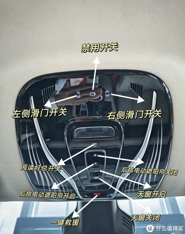 车顶按键:左/右侧滑门开关,阅读灯开关,天窗开关,一键救援