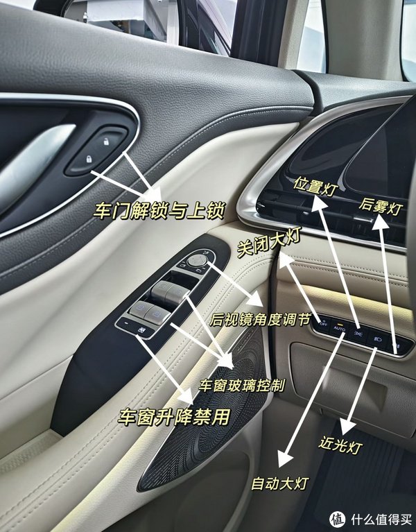 主驾车门:车门解锁与上锁,后视镜角度调节,近/远光灯,自动大灯,后雾灯