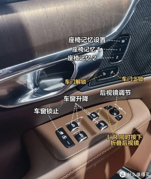 主驾车门:座椅记忆设置,车门解锁,车窗升降,车窗锁止,后视镜折叠